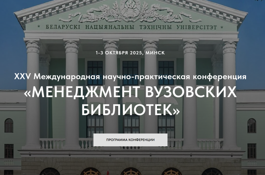 Белорусский национальный технический университет, Научная библиотека БНТУ приглашают вас принять участие в работе 25-й Международной научно-практической конференции «Менеджмент вузовских библиотек», которая состоится 1-3 октября 2025 года в г. Минске. В работе конференции примут участие сотрудники отдела научных исследований открытой науки ГПНТБ СО РАН.