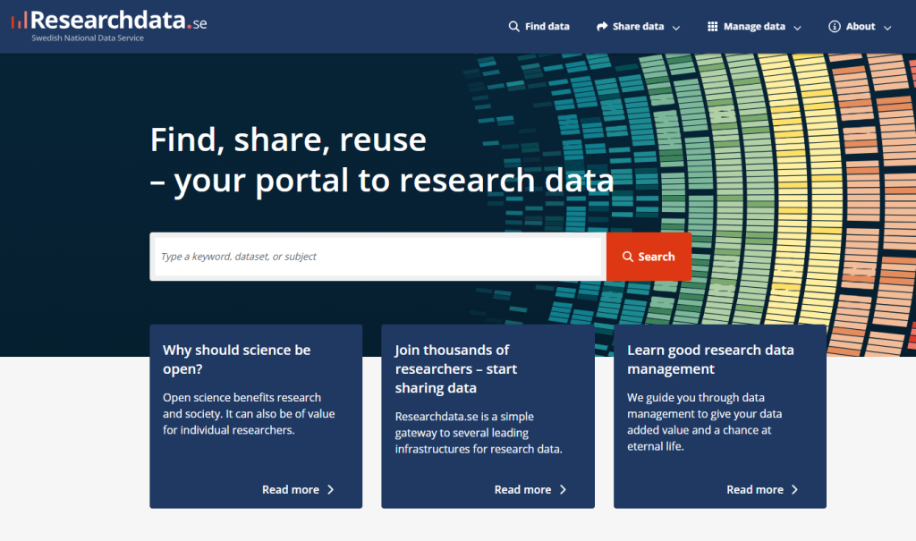 Портал открытых научных данных Швеции (https://researchdata.se) — это национальный веб-портал, где вы можете находить, делиться и повторно использовать исследовательские данные из самых разных дисциплин. Сайт был запущен в марте 2025 года, на данный момент он включает 6362 наборов данных, преимущественно в виде таблиц, текстов и геоданных. Более половины данных происходят из области естественных наук, много лингвистических данных из Språkbanken Text. Не все данные размещены на самом портале, многие ведут на оригинальные публикации в национальных и международных репозиториях данных.
