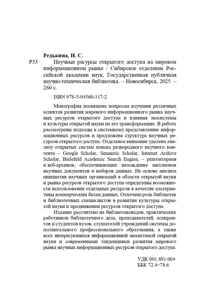Рады сообщить, что вышла в свет монография Н. С. Редькиной «Научные ресурсы открытого доступа на мировом информационном рынке». Издание посвящено вопросам изучения различных аспектов развития мирового информационного рынка научных ресурсов открытого доступа и влияния экосистемы и культуры открытой науки на его трансформацию. В работе рассмотрены подходы к системному представлению информационных ресурсов и предложена структура научных ресурсов открытого доступа. Отдельное внимание уделено анализу открытых систем поиска разнородного научного контента – Google Scholar, Semantic Scholar, Internet Archive Scholar, Bielefeld Academic Search Engine, – репозиториев и веб-архивов, обеспечивающих нахождение миллионов научных документов и наборов данных. На основе анализа инициатив научных организаций в области открытой науки и рынка ресурсов открытого доступа определены возможности использования отдельных ресурсов в качестве альтернативы коммерческим базам данных. Отмечена роль библиотек и библиотечных специалистов в развитии культуры открытой науки и продвижении ресурсов открытого доступа. Издание рассчитано на библиотековедов, практических работников библиотечного дела, преподавателей, аспирантов и студентов вузов, слушателей учреждений системы дополнительного профессионального образования, а также всех интересующихся информационной экосистемой открытой науки и современными тенденциями развития мирового рынка научных информационных ресурсов открытого доступа.